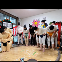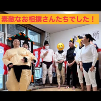 また、職員が相撲の着ぐるみを着て手作りの土俵で取り組むなど、笑いの絶えない時間となりました。写真とともにその様子をご紹介します。