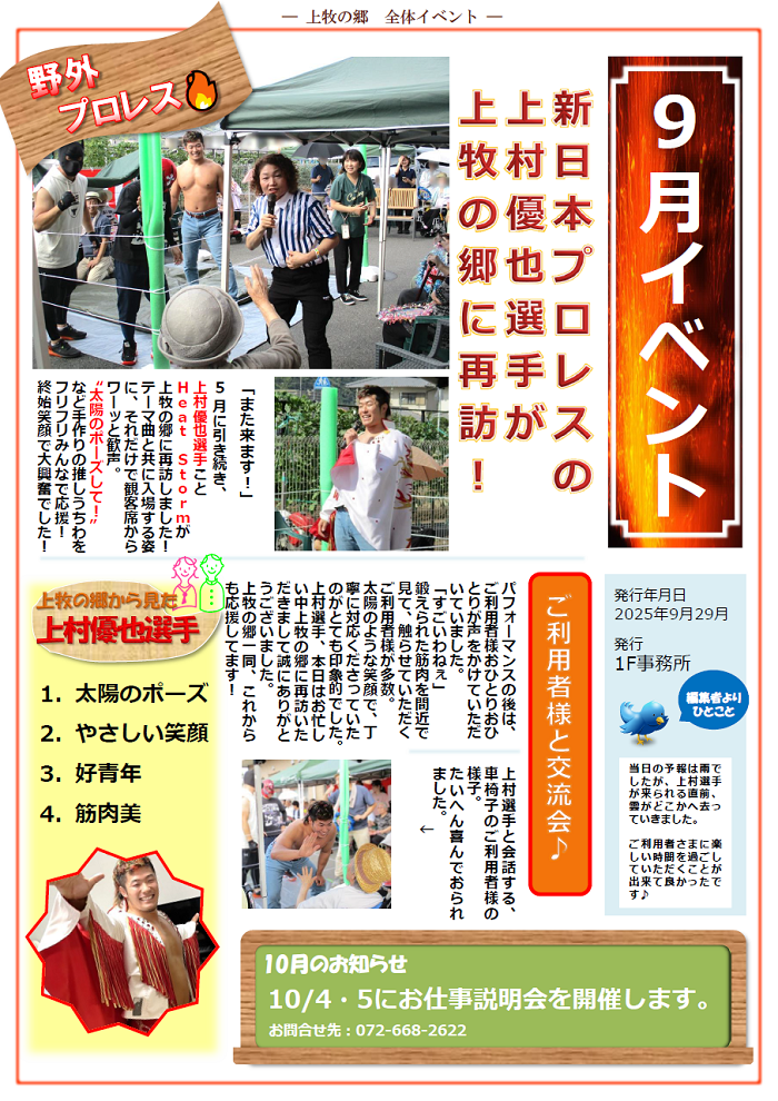 また、ご縁がありまして、プロレスラーの上村優也選手が上牧の郷に