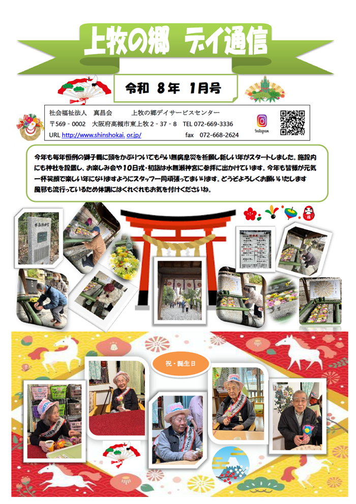 上牧の郷デイサービスセンター デイ通信(令和8年1月号) 投稿日: 2026年1月30日 投稿者: admin いつもお世話になっております。 上牧の郷デイサービスセンター デイ通信(令和8年1月号)をお届けいたします。