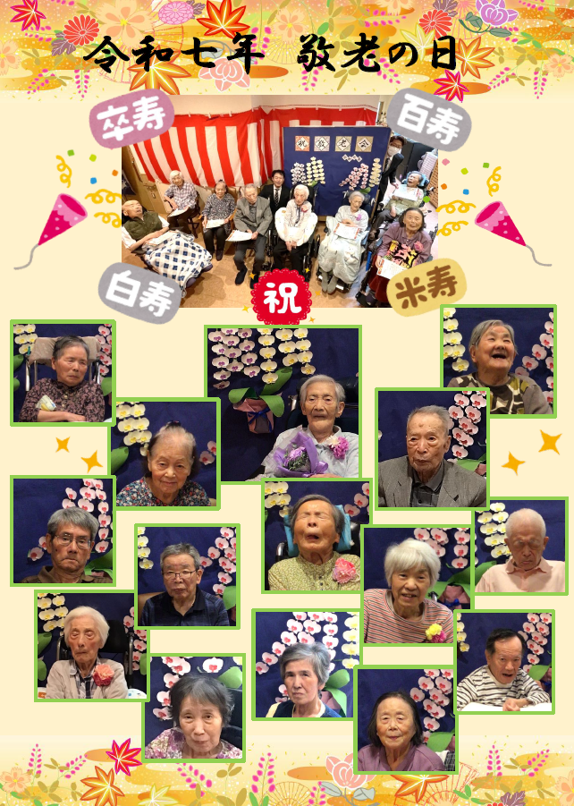 特別養護老人ホーム上牧の郷(令和7年9月) 投稿日: 2025年10月2日 投稿者: admin いつもお世話になっております。 特別養護老人ホーム上牧の郷から、9月の敬老のお祝いの様子についてご紹介します。 今年は、百寿・白寿・卒寿・米寿の節目を迎えられた方々がおられ、 95歳以上のご長寿の方とともに施設長からお祝いの書状を贈らせていただきました。 そして胡蝶蘭を背景に記念撮影を行いました♪ これからもみなさまと一緒に、笑顔あふれる日々を積み重ねていきたいと思います。