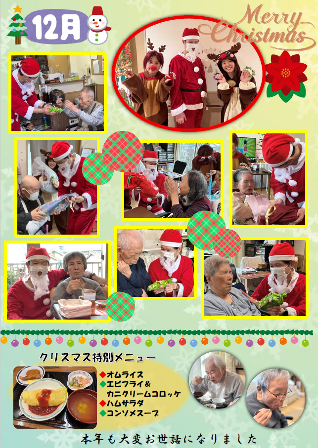 特別養護老人ホーム上牧の郷(令和7年12月) 投稿日: 2025年12月30日 投稿者: admin いつもお世話になっております。 特別養護老人ホーム上牧の郷から、クリスマスの様子をご紹介します。 24日に施設長サンタさんとノリノリなトナカイさんたちがやって来て、 お一人おひとり、ユニット職員が選んだプレゼントを、サンタさんから手渡しして回りました。 25日の昼食には、クリスマス特別メニューが提供されました♪ クリスマスが終わり、各ユニットではお正月の準備を始めています。 みなさま、どうぞ良いお年をお迎えください。